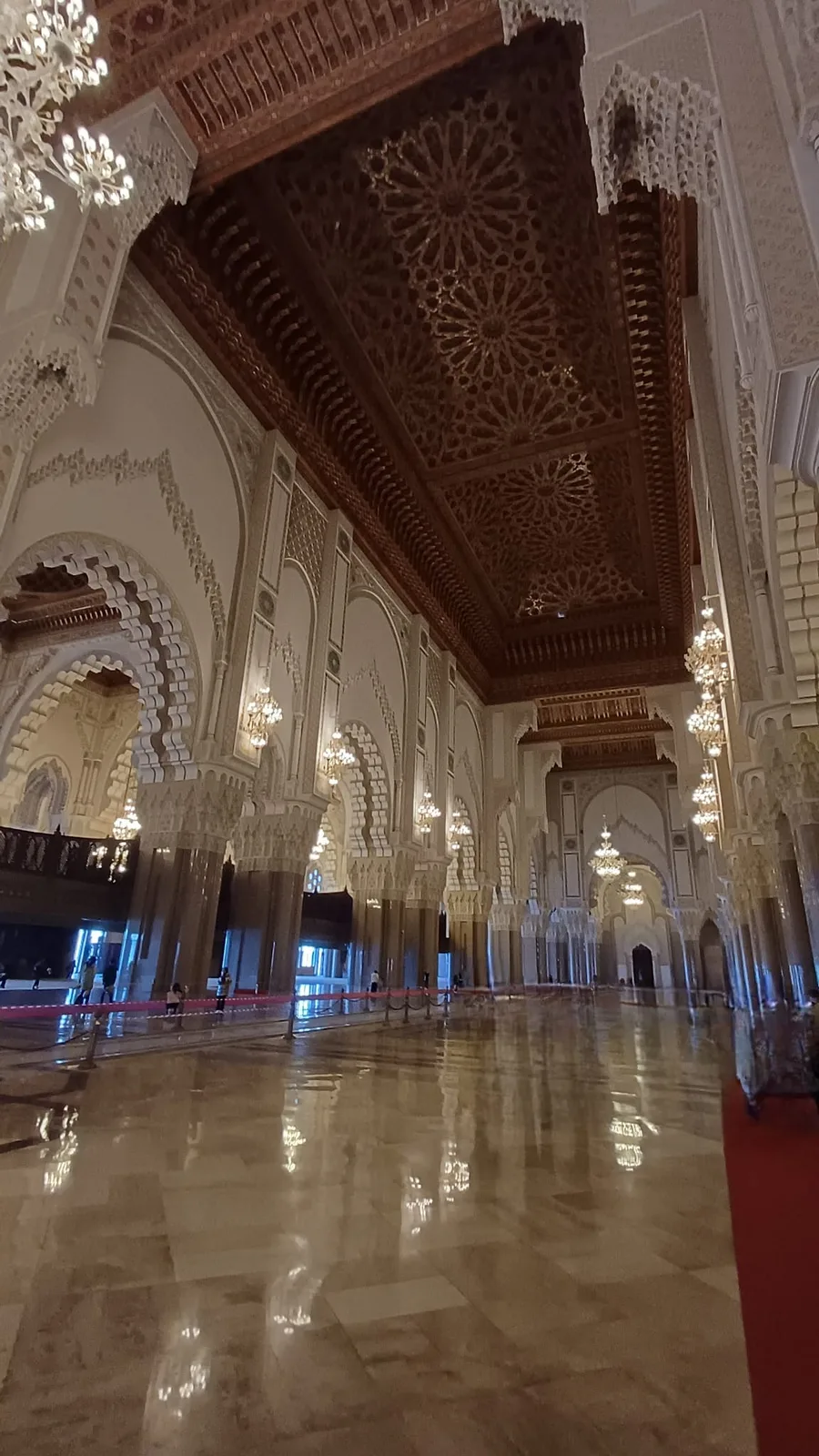Architekt byl Francouz Michelle Pinseau , přítel krále...materiály jsou místní...střecha cedrová a otevírací (trvá to 2 min), lustry jsou spouštěcí na čištění 2x ročně, mramor je z Agadiru,Merzougy atd., ozvučení je skryto ve štukách a v cedrovém stropě...Král jezdí 2x ročně branou z ruského titanu,